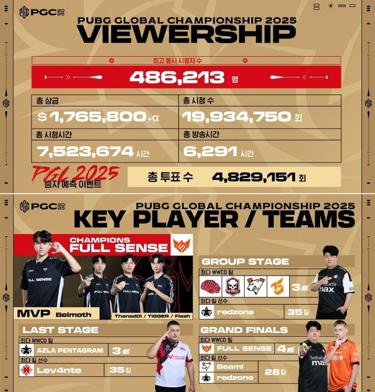 12월 14일 태국 방콕에서 개최한 ‘펍지 글로벌 챔피언십(PGC)’의 'PGC 2025 그랜드 파이널' 성료와 함께 인포그래픽을 공개했다. 총 시청자 수가 1993만4750회이며 최고 동시 접속자가 48만6213명이다.