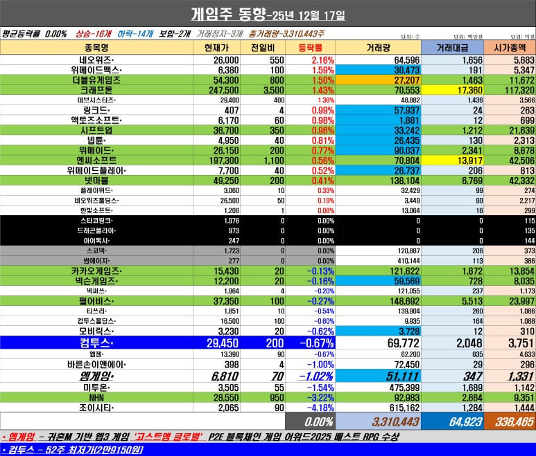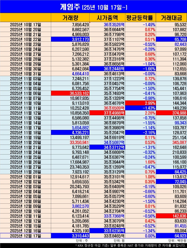 | [주간등락률]끝모를 하락! 게임주, 거래 뚝+34조 붕괴 (0) | 2025.12.13 |