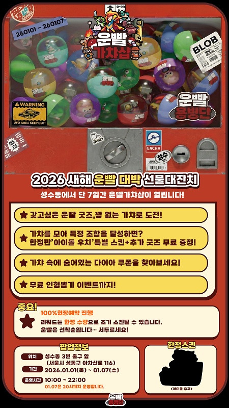 2026년 새해를 맞아 '운빨존많겜' 오프라인 팝업스토어 ‘운빨가챠샵’을 2026년 1월 1일부터 7일까지 성수동에서 운영한다.