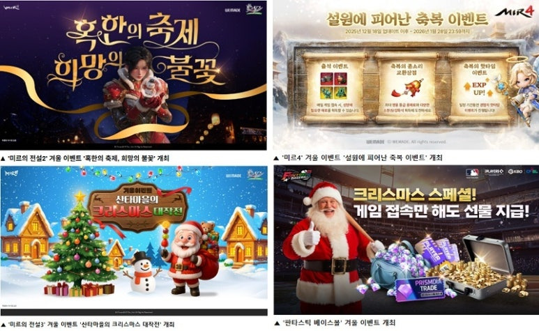 크리스마스를 기념해 대표 게임 6종에서 특별 이벤트를 진행한다. 미르의전설2, 3, 4, 나이트 크로우, 판타스틱 베이스벌, 레전드 오브 이미르 등이다.