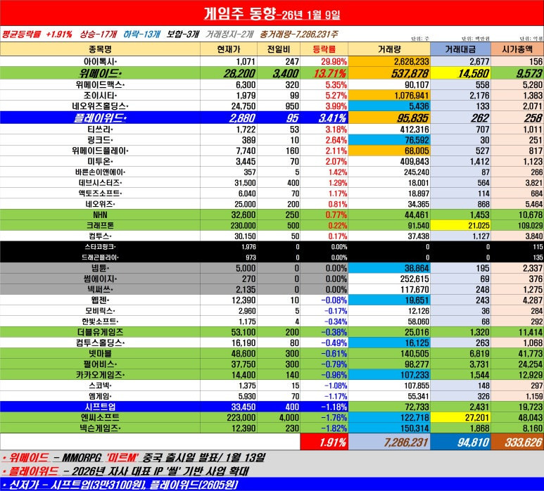 1월 9일, 상승 마감한 게임주식은 17개다.