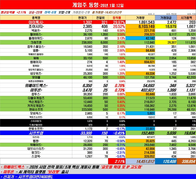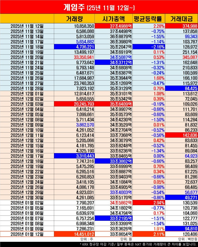 게임주식은 평균등락률 +2.11%로 2026년 첫 거래일(1월 2일) +2.94%에 이어 두 번째로 +2% 이상을 나타냈다.