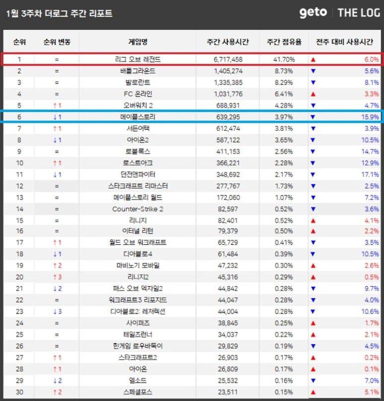 게토PC방 기반 통계 서비스 더 로그의 2주차 온라인 게임 순위를 공개했다. 전월 대비 13.7% 감소한 가운데 리그 오브 레전드가 LCK 개막 등으로 5% 증가했다. 미친 역주행을 펼쳤던 넥슨의 메이플스토리는 15.9% 감소, 6위로 이전보다 한 계단 하락했다.