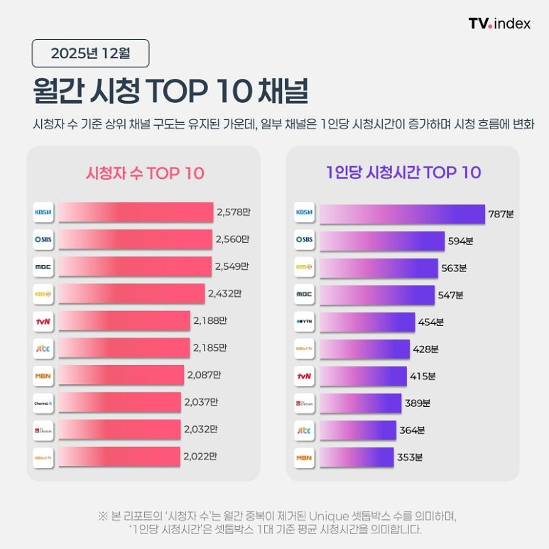 자사 TV 시청 데이터 분석 솔루션을 활용해 작성한 TV 인덱스 '2025년 12월 채널 시청 분석' 리포트를 공개했다.