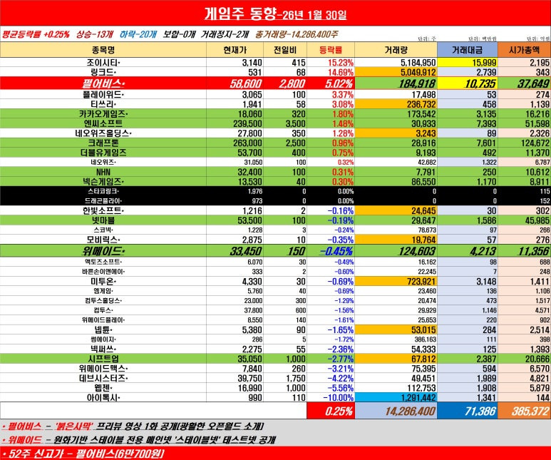 펄어비스가 +2.51%로 더블유게임즈(+0.38%), 카카오게임즈(+0.11%) 등은 오름세를 지속했고 nhn이 보합으로 마감했다.