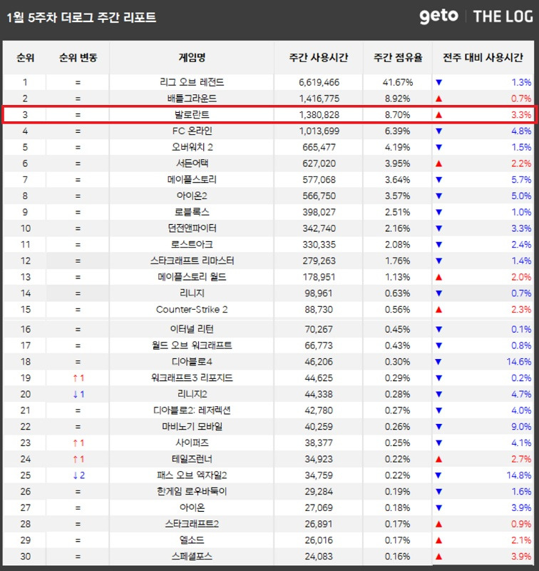 PC방 통계 서비스 '더로그' 기반 1월 마지막 주 온라인게임 순위를 공개했다. 대다수 게임들의 이용시간이 감소한 가운데 발로란트가 3.3% 증가했다. 톱10에서의 순위 변화는 없었다.