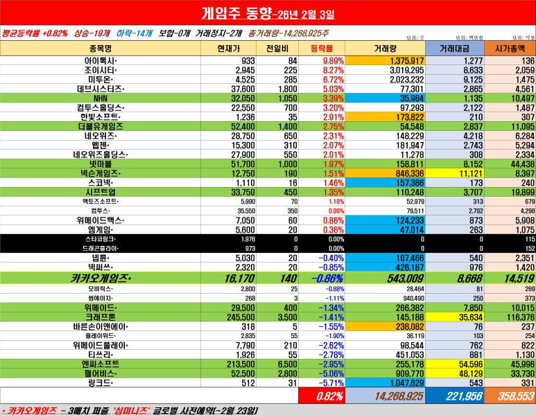 게임주식은 평균등락률이 +0.82%다. 최근 2거래일 폭락에서 탈출했다.