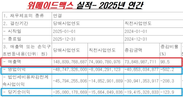 위메이드맥스의 2025년 매출은 1488억3900만원으로 이전대비 95.5% 늘었다. 영업손실과 당기순손실은 각각 487억4700만원, 350억8000만원으로 적자를 지속했다.