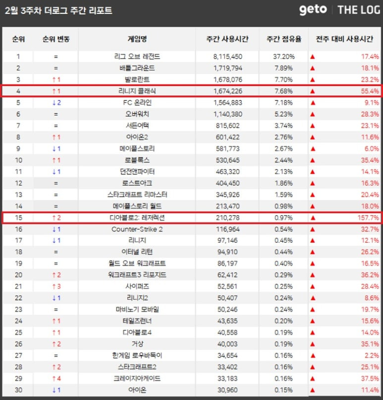 게토PC방에 기반한 통계 서비스 '더로그'의 2월 3주차 온라인 게임 순위를 공개했다. 연휴로 주춤했던 대다수 게임의 이용 시간이 폭증했다. 특히 디아블로2 제러렉션이 157% 늘었고 엔씨소프트의 리니지 클래식이 55.4%로 증가했다.