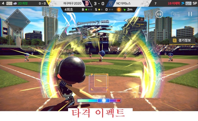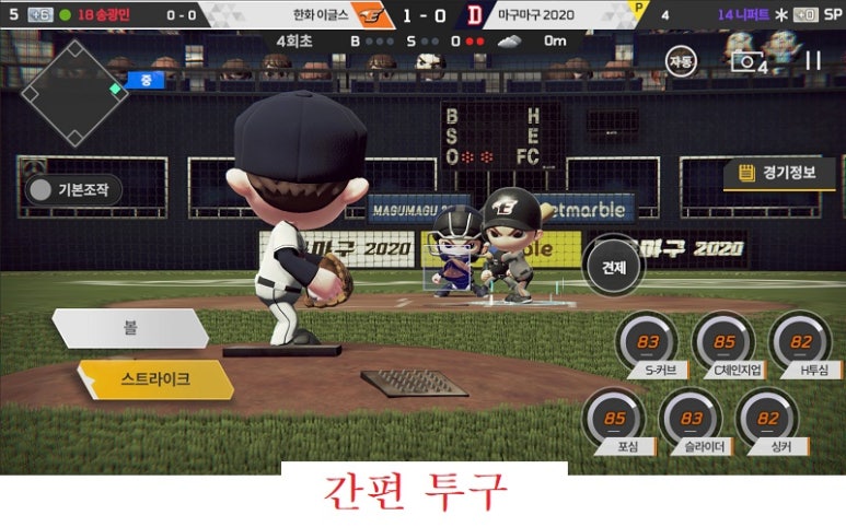 동시에, 기존 야구게임 이용자들을 위해 ‘숙련조작’도 지원한다. ‘숙련조작’은 PC 온라인 게임 ‘마구마구’ 조작방식과 매우 유사하다. 공이 올 것 같은 위치와 일반/파워 타격 여부를 선택하는 과정에서 상대방과 치열한 심리전을 경험할 수 있다.
