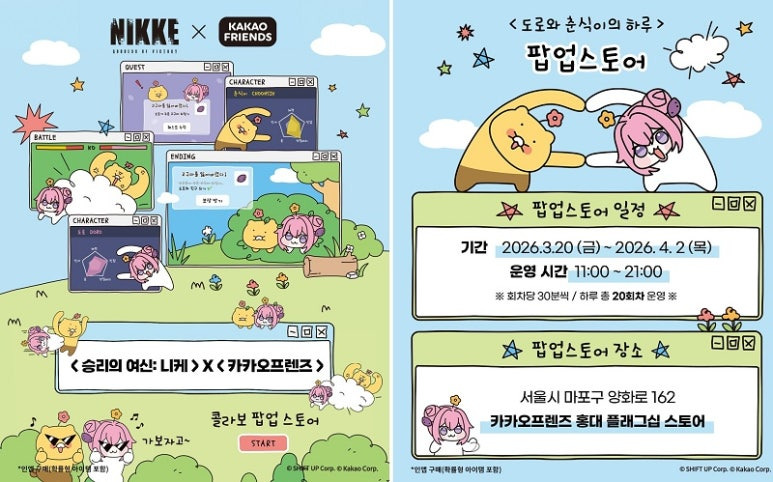 인기 서브컬처 건슈팅 RPG ‘승리의 여신: 니케’가 카카오프렌즈와 협업한 굿즈 공개와 함께 콜라보 팝업스토어 ‘도로와 춘식이의 하루’를 3월 20일까지 카카오프렌즈 홍대플래그십 스토어에서 운영한다.
