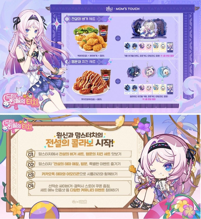 오픈월드 어드벤처 RPG ‘원신’에서 토종 버거·치킨 브랜드 맘스터치의 콜라보레이션 ‘도전! 전설의 터치’를 4월 24일까지 진행한다. 이를 기념, 카카오톡 테마와 이모티콘을 선보였다.