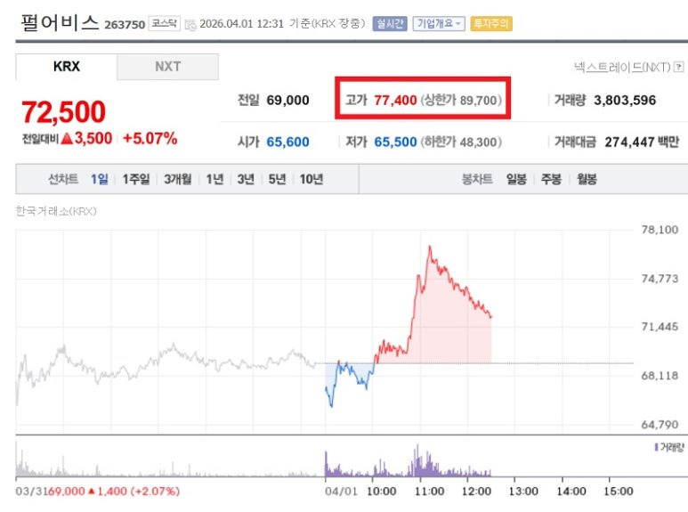 4월 1일(수) 장중 12% 넘게 상승한 7만7400원까지 오른 것.