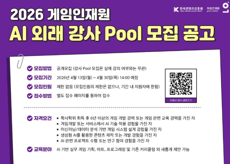 인공지능 환경에 대응할 전문 인력을 발굴하기 위해 ‘2026년 게임인재원 인공지능(AI) 외래 강사 1차 모집’을 4월 30일까지 실시한다.