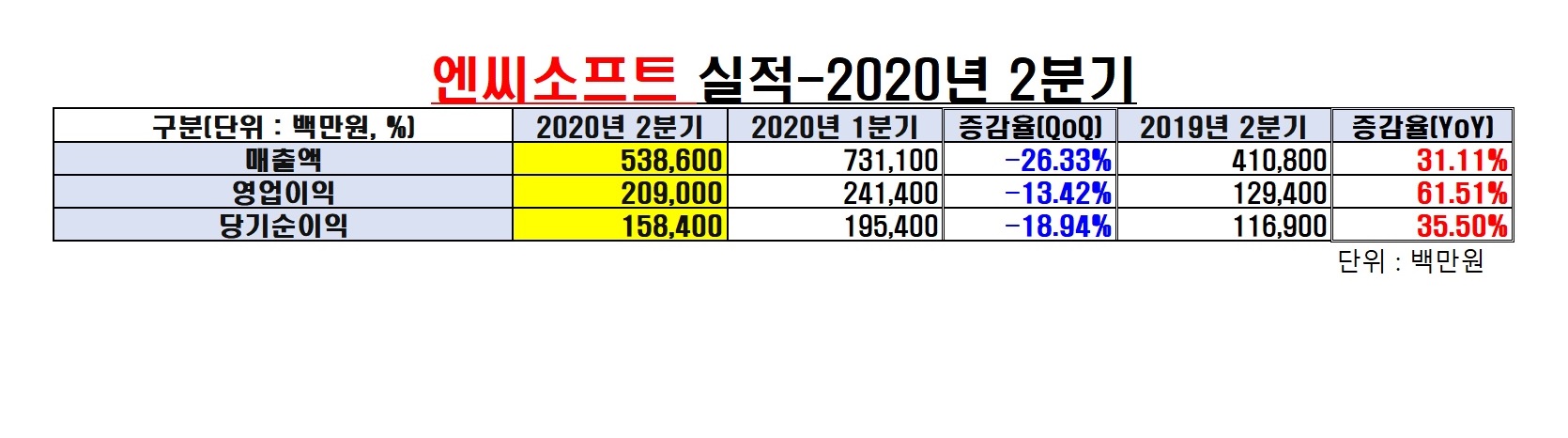 '리니지' 후예들을 앞세운 엔씨소프트의 성장이 지속됐다. 2020년 2분기 매출, 영업이익, 당기순이익 등이 지난해 같은 기간보다 30% 이상 증가한 것. 지난 1분기 대비해서는 주요 지표가 10% 넘게 감소, 역성장했다.